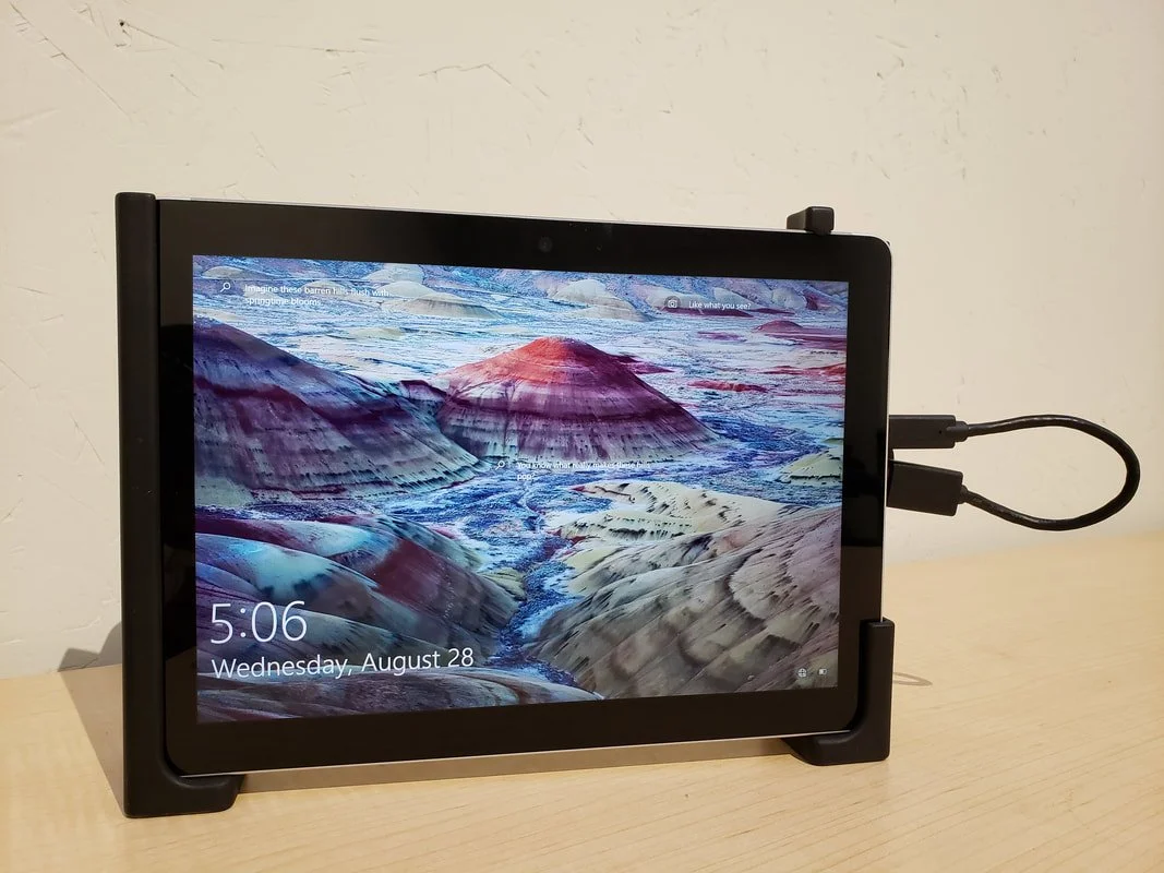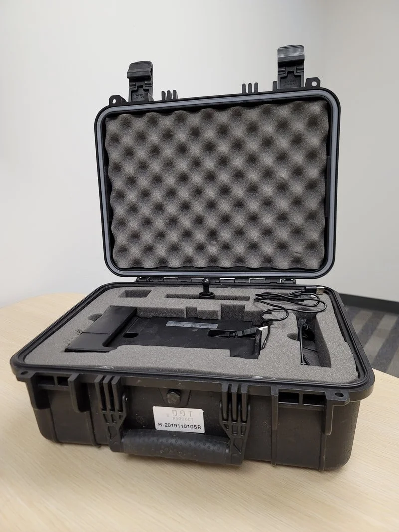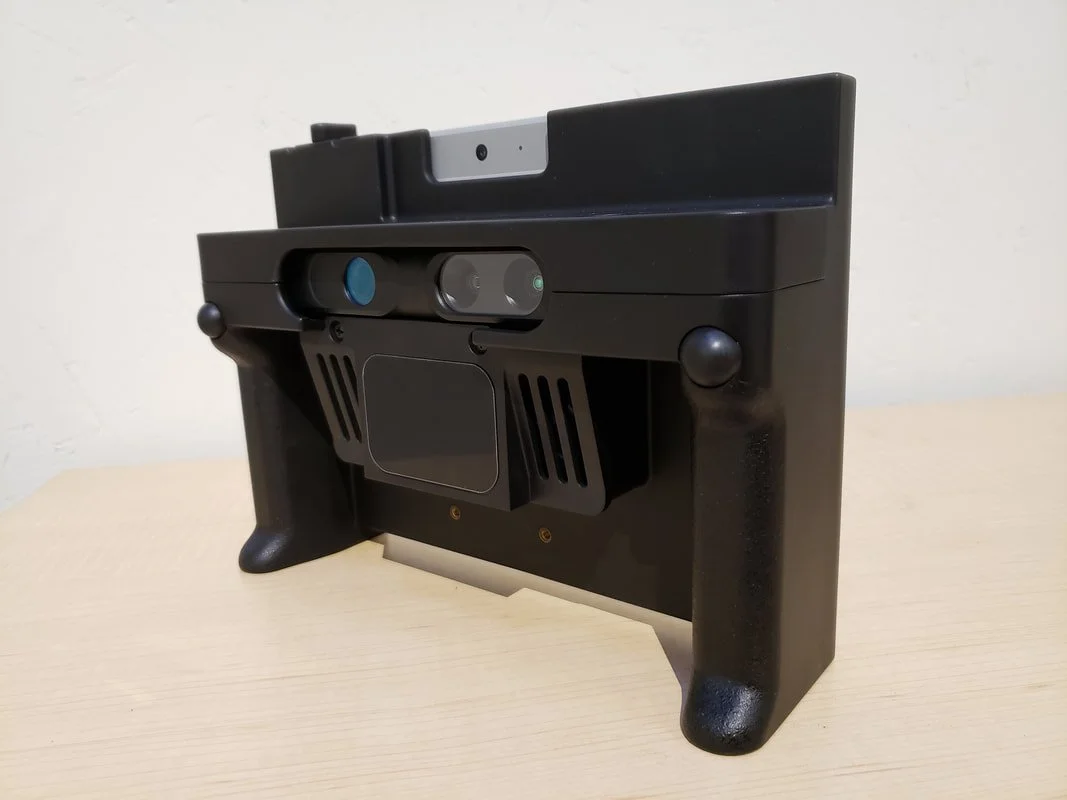 The DPI-10 (2-12 ft range) and DPI-10SR (1-6 ft range) are our flagship complete handheld 3D scanning kits. These kits are only compatible with Microsoft Surface Go (1, 2, or 3) or Samsung Galaxy Tab S6 tablets, which secure snugly into the complete dual-grip housing as shown below. Their DP-calibrated PrimeSense Carmine 3D cameras are also fully embedded into this dual-grip housing, and a rugged carrying case is included with every kit.