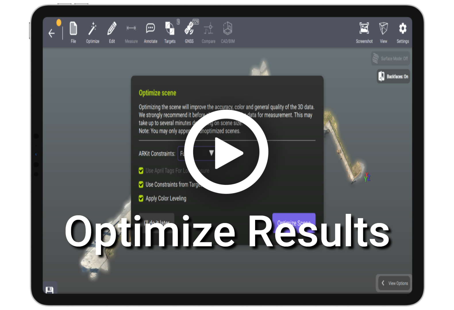 Optimization is where the magic of Dot3D really shines. This critical post-processing step drastically improves the overall quality of every scan you take. Simply click optimize after scanning to watch as your data quality automatically improves in a variety of ways. Dot3D’s optimization is always fast, local, and secure. And can happen immediately after capture in the field, or at any time later, either on the same device or another.